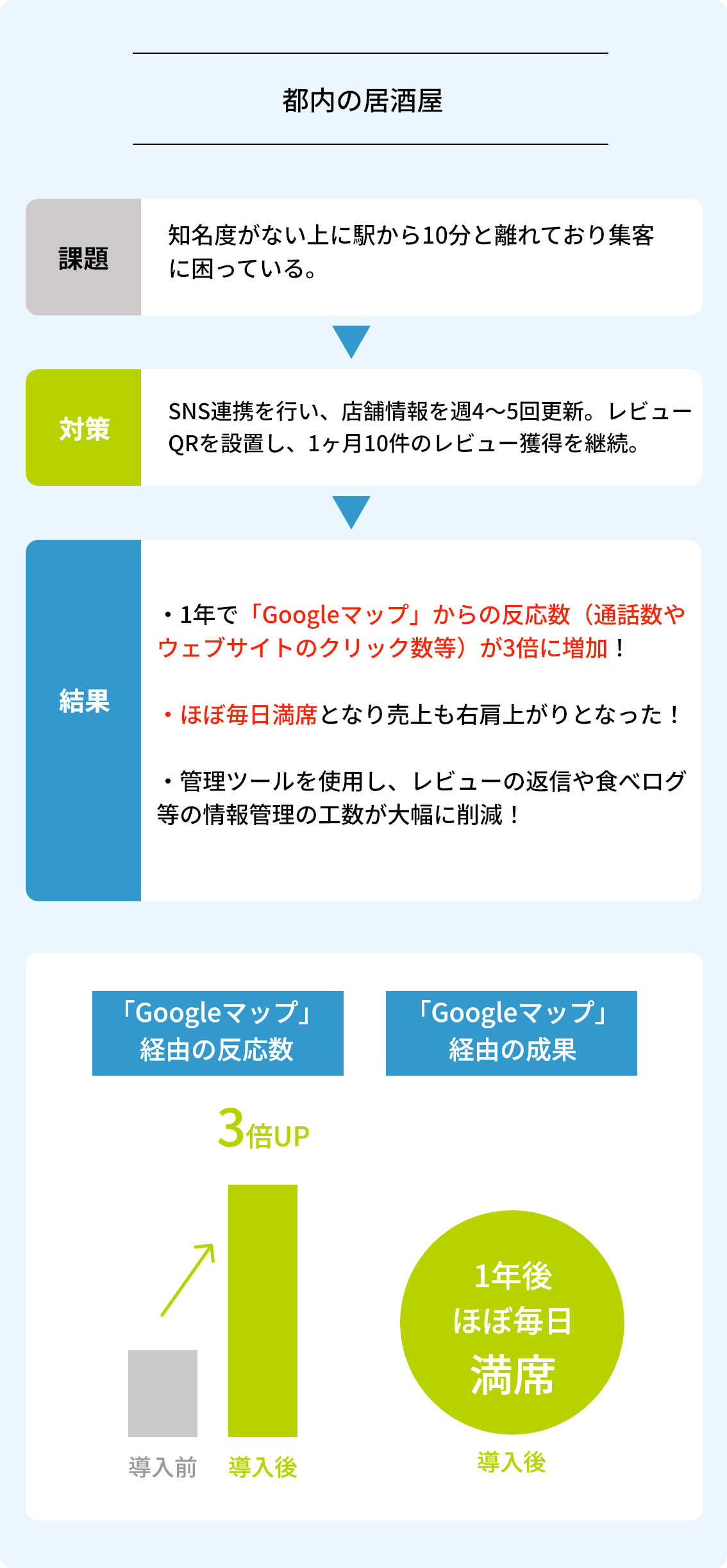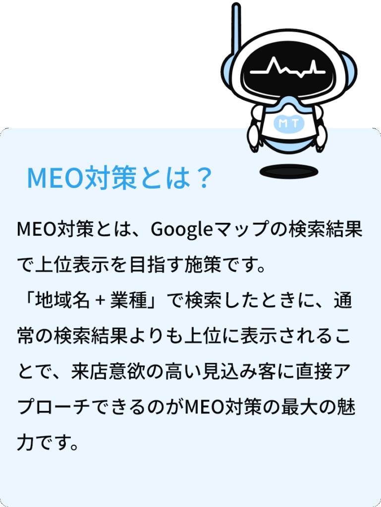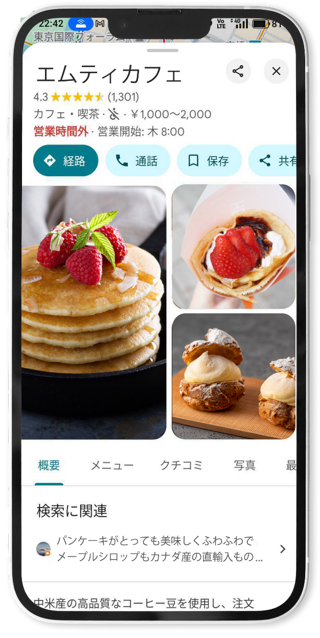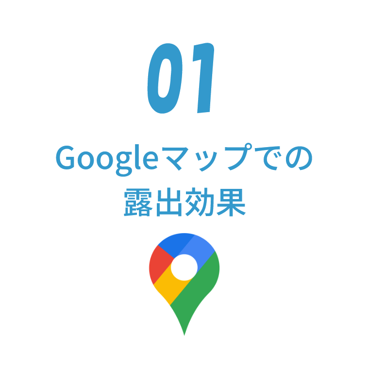 「地域名+業種」で検索したときに貴店のMapを上位に表示Googleマップに貴店の表示を増やすことで、ユーザーの目に止まる回数を増やします。