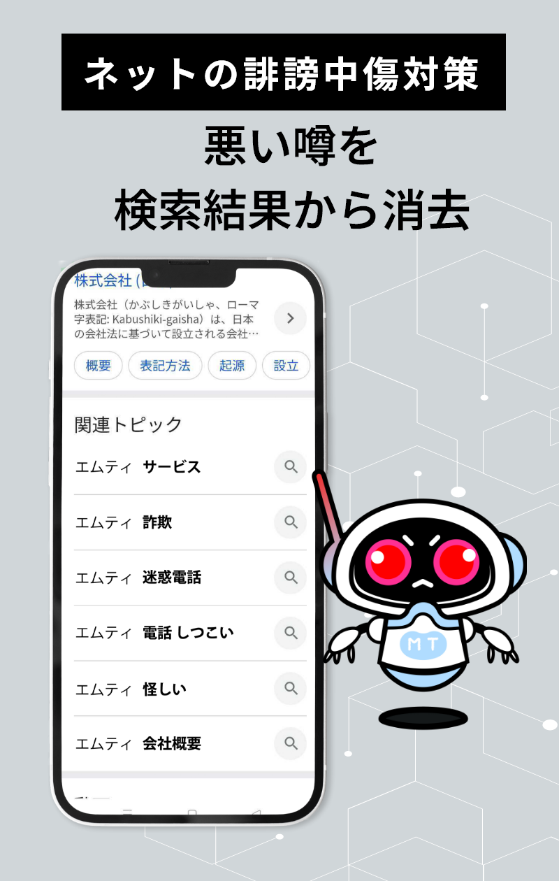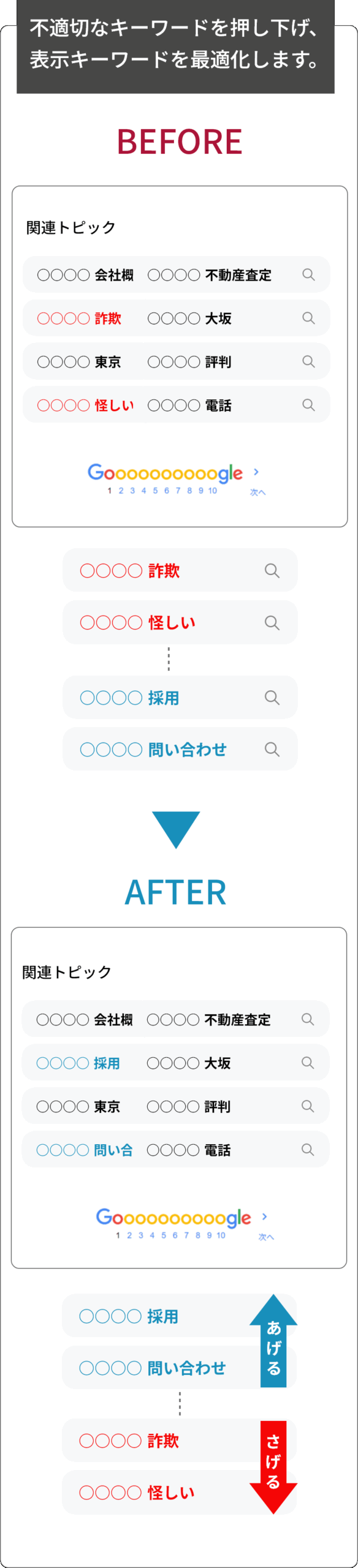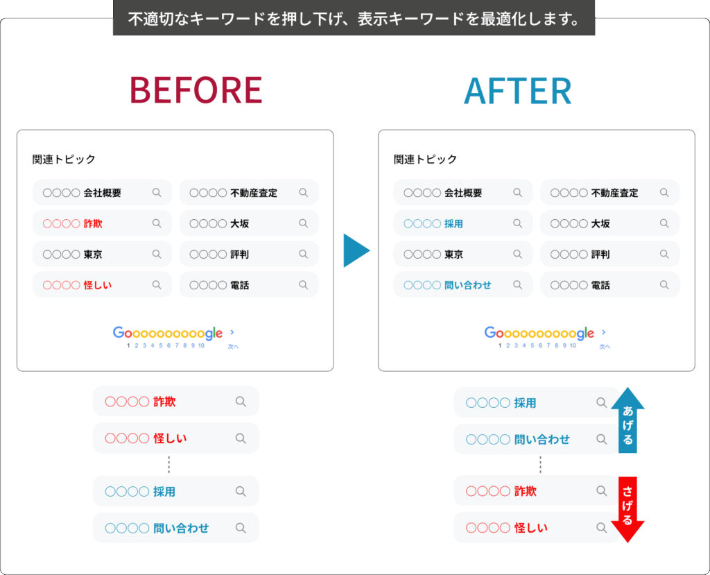 ・サジェストや関連キーワードの対策で、企業や個人の信頼回復をサポート。
